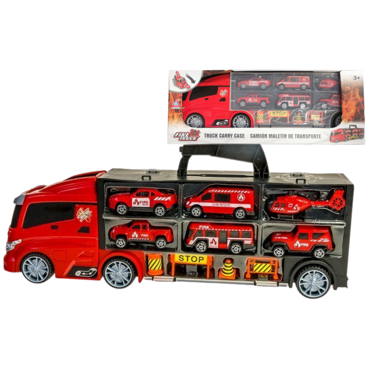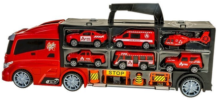 W ciężarówce znajduje się 5 pojazdów straży pożarnej oraz helikopter. Dodatkowo w zestawie znajdziecie również pachołki drogowe. Akcesoria pozwalają na odwzorowanie akcji straży pożarnej. Scenariusz zależy tylko od waszej wyobraźni!