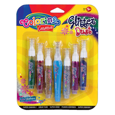 Zestaw 6 brokatów w tubach z łatwym aplikatorem oraz bezbarwny klej do utrwalenia pracy.
