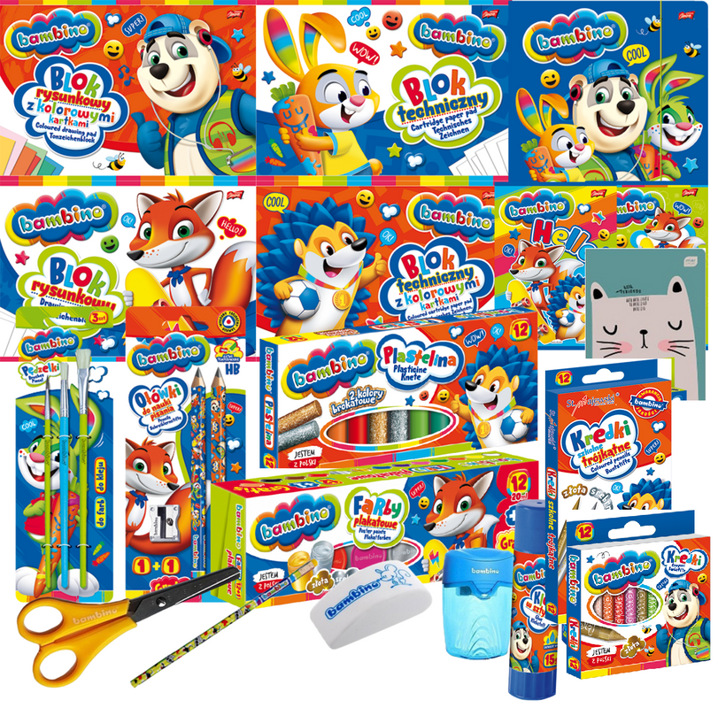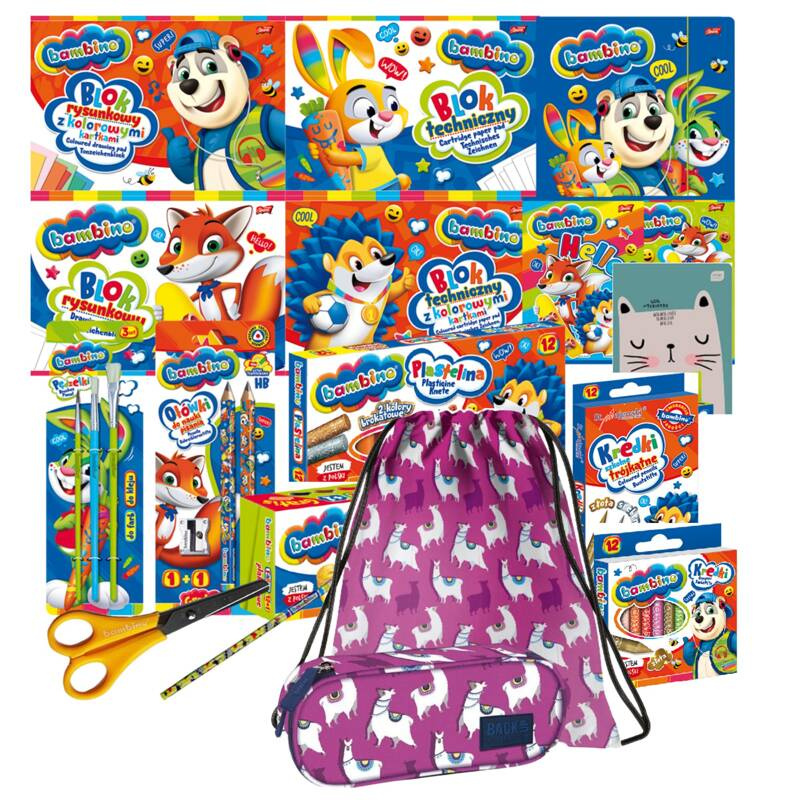 Kompletna wyprawka skomponowana z dobrej jakości produktów Bambino. Zawiera produkty niezbędne do rozpoczęcia szkolnej przygody.